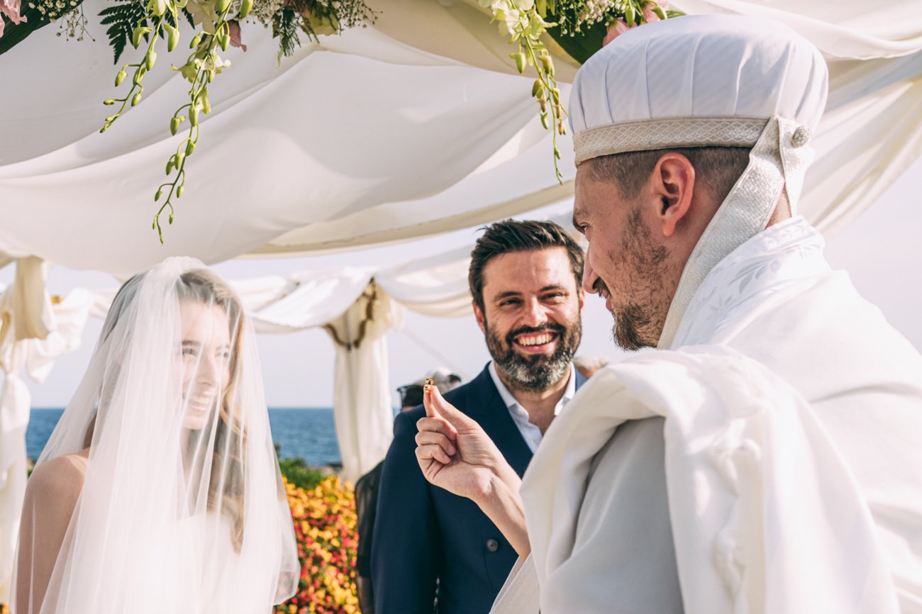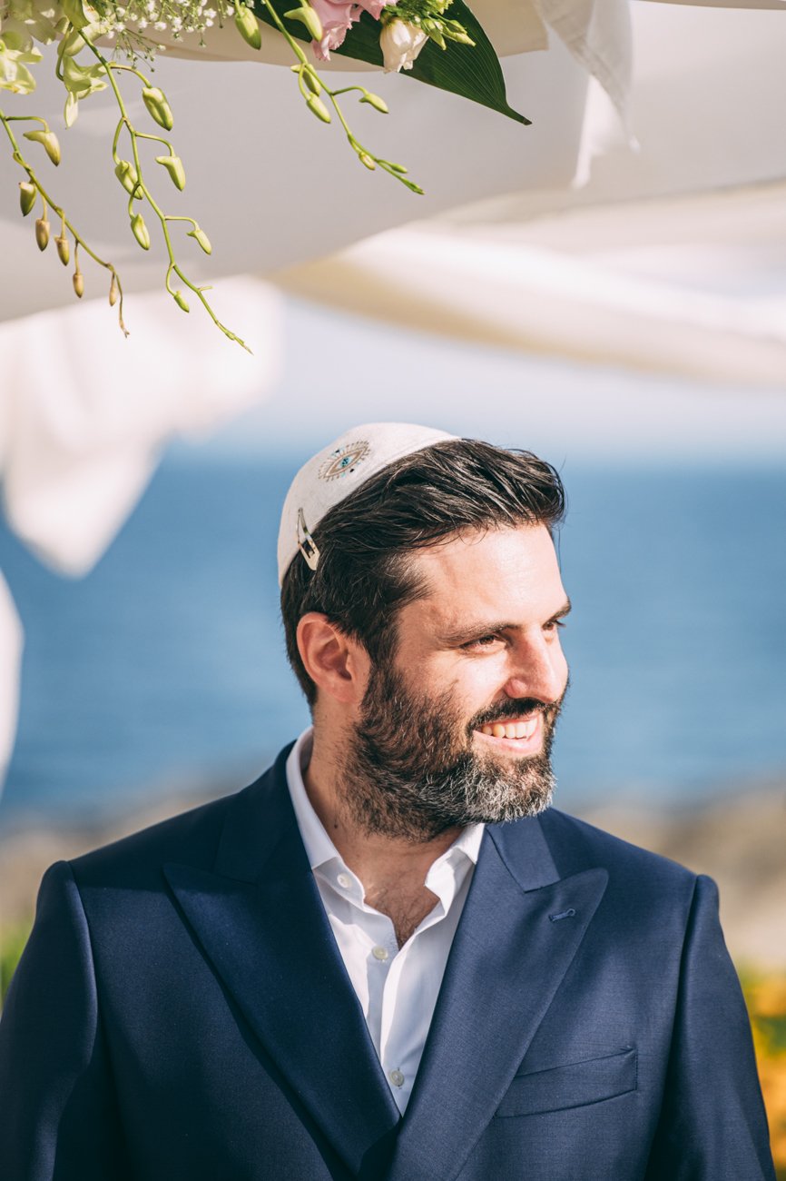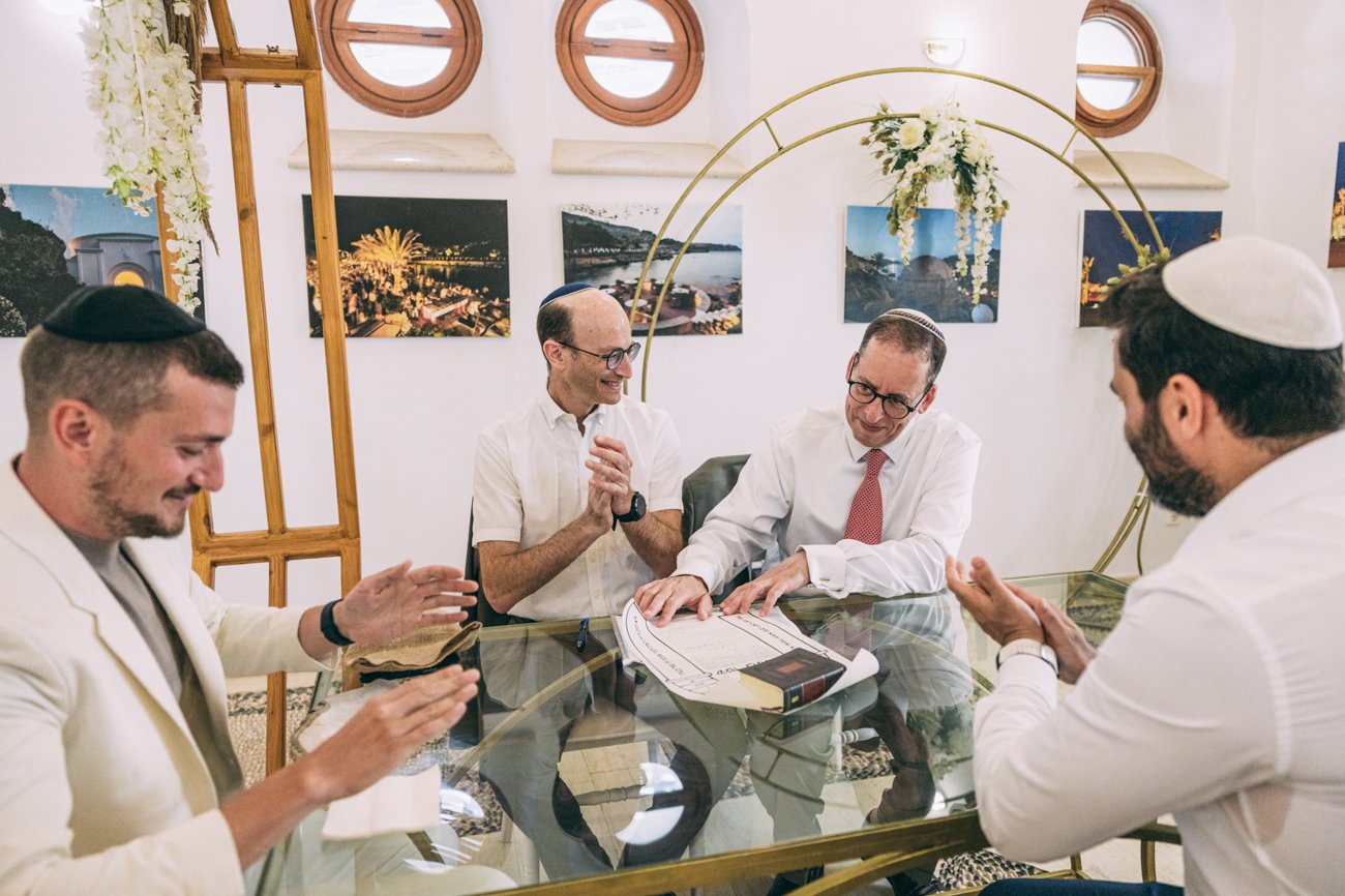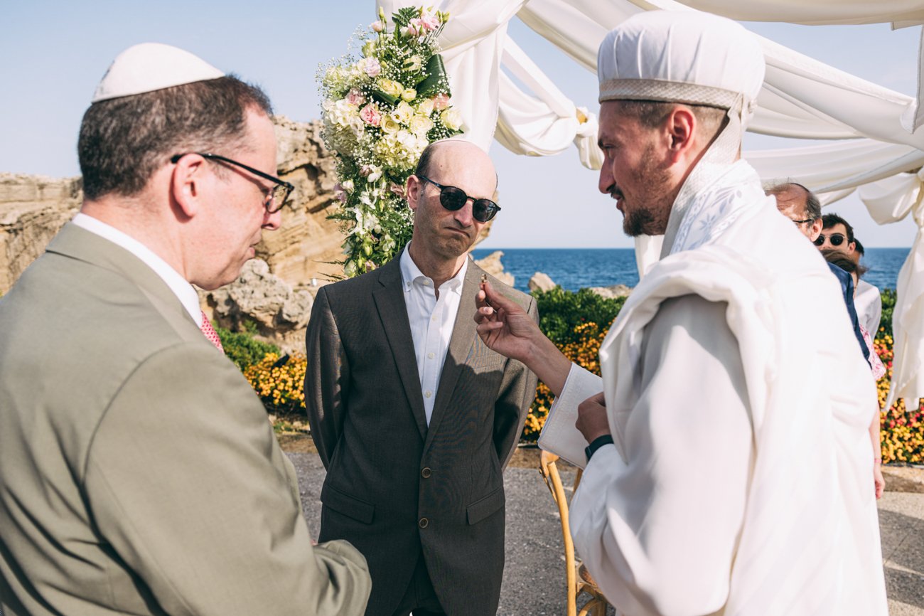 The Ketubah is a symbolic Jewish marriage contract that outlines the groom’s obligations to the bride. Jeremy, together with the rabbi and two male witnesses, signed the contract. In some weddings, the rabbi hands over the document to the bride for her agreement, as happened in this case. As a wedding photographer in Rhodes, it was great to capture these beautiful moments.