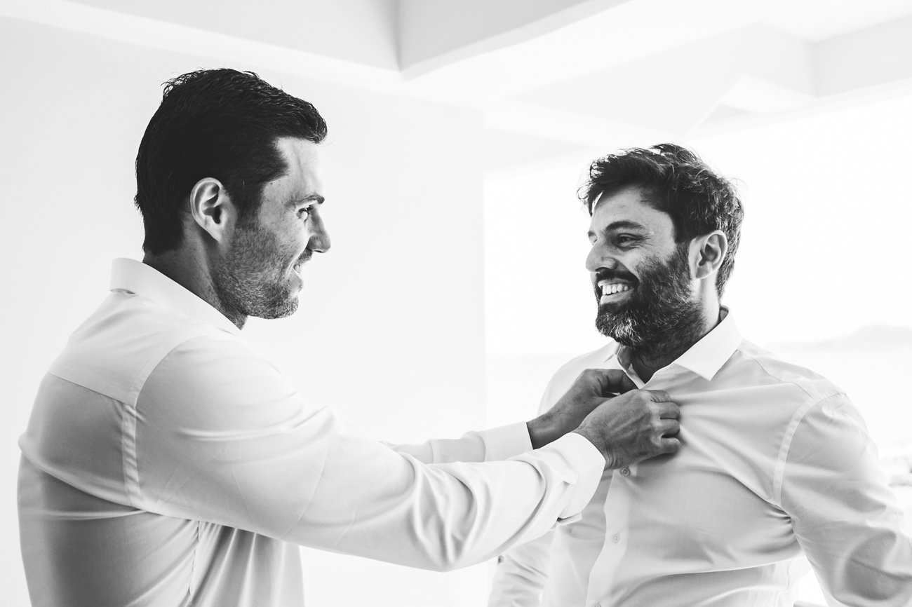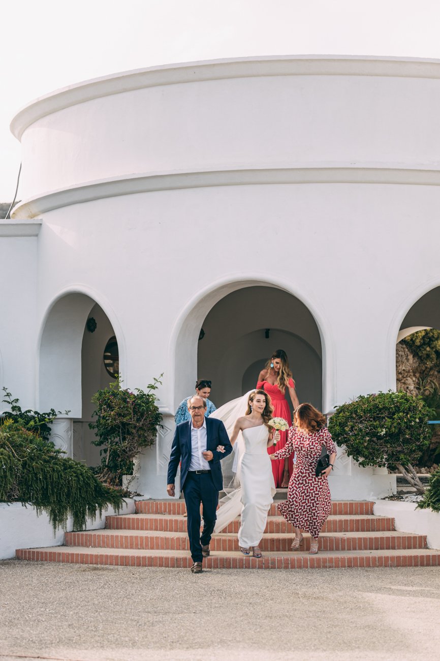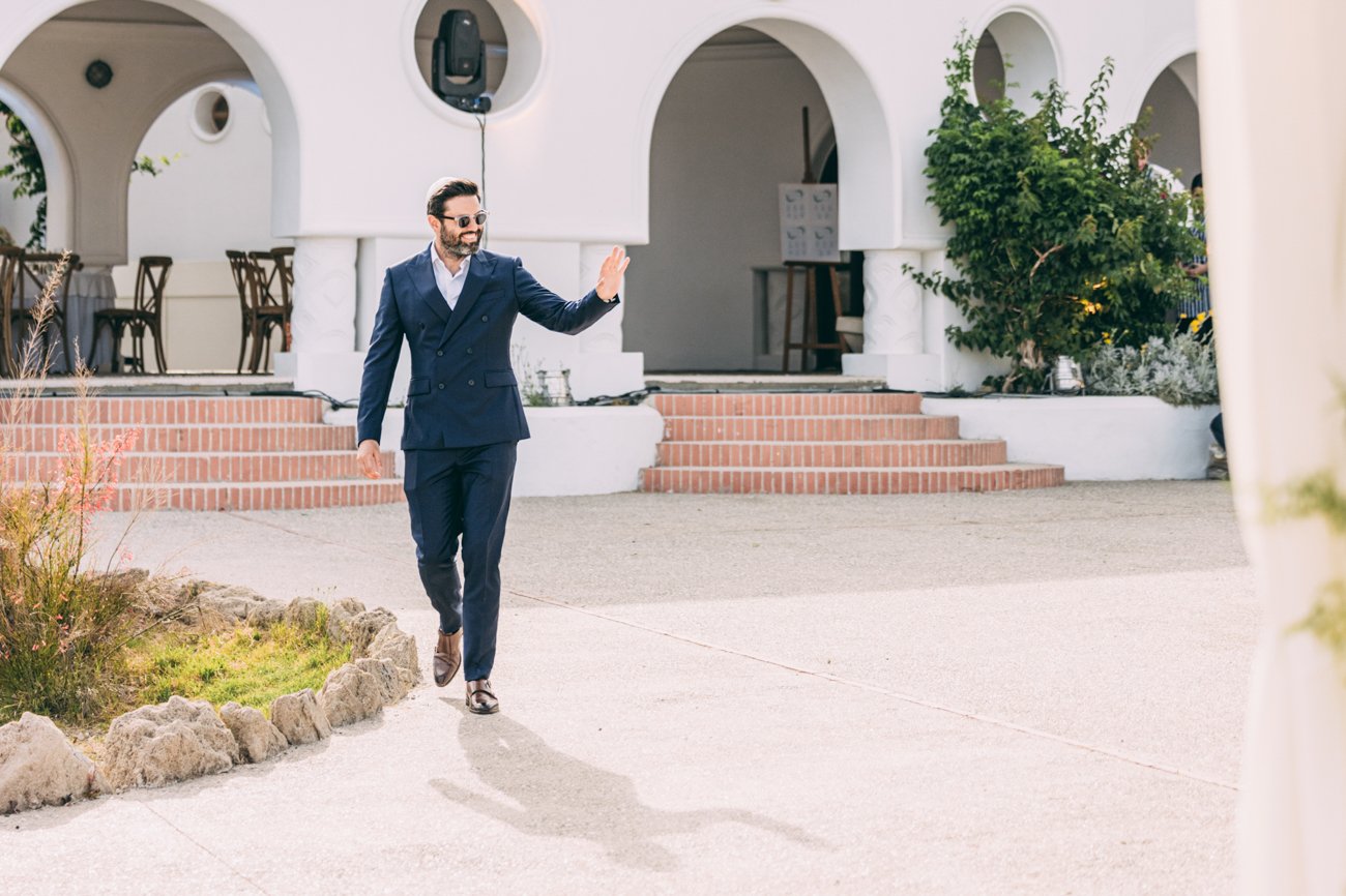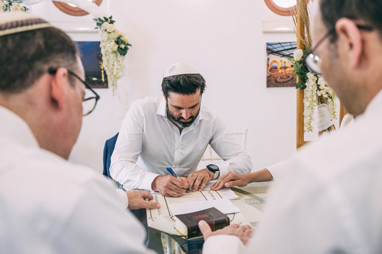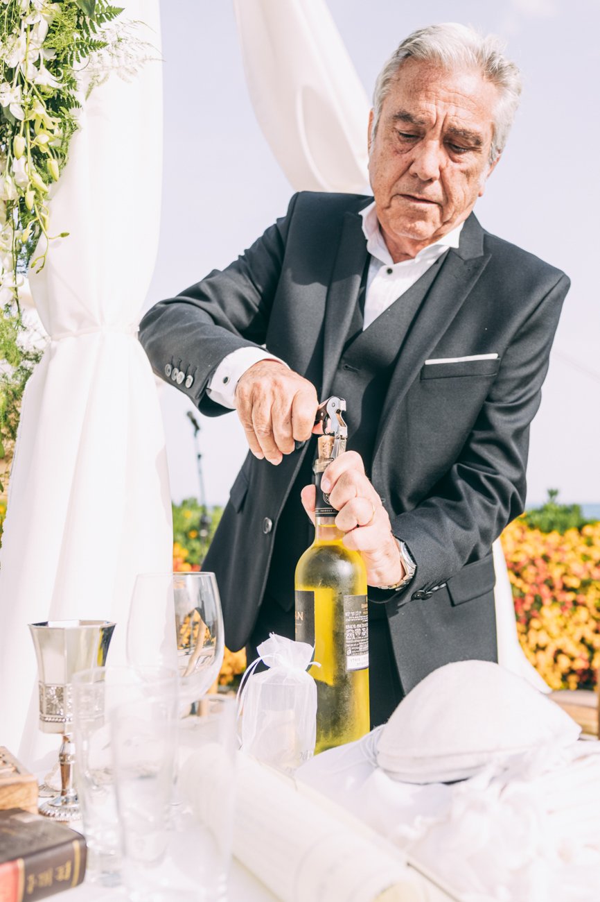 The Ketubah is a symbolic Jewish marriage contract that outlines the groom’s obligations to the bride. Jeremy, together with the rabbi and two male witnesses, signed the contract. In some weddings, the rabbi hands over the document to the bride for her agreement, as happened in this case. As a wedding photographer in Rhodes, it was great to capture these beautiful moments.