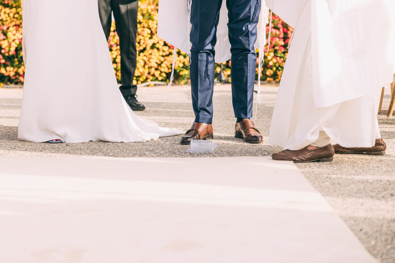 During the wedding ceremony, seven blessings are recited over a cup of wine. This is called Sheva B’rachot and it offers praise and gratitude to God for creating the couple and bringing them together. The final blessing is sealed with the breaking of a glass, which symbolizes the destruction of the Temple in Jerusalem and the reminder that even in moments of joy, we must remember the pain and suffering in the world. Right after, everyone will shout “Mazel Tov!”, which means good luck.
