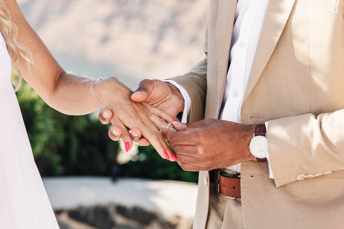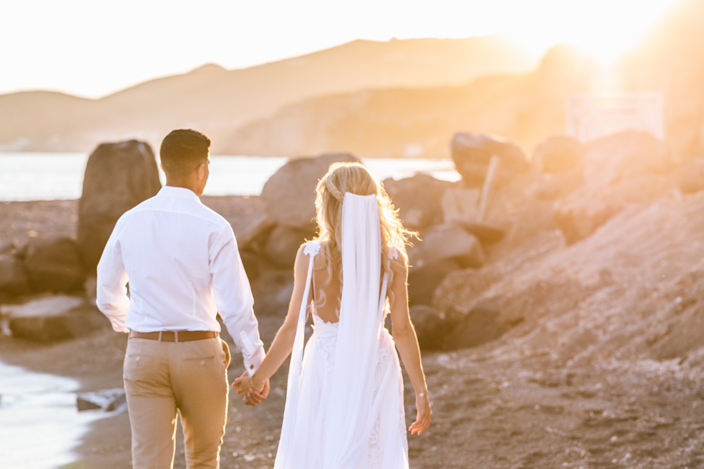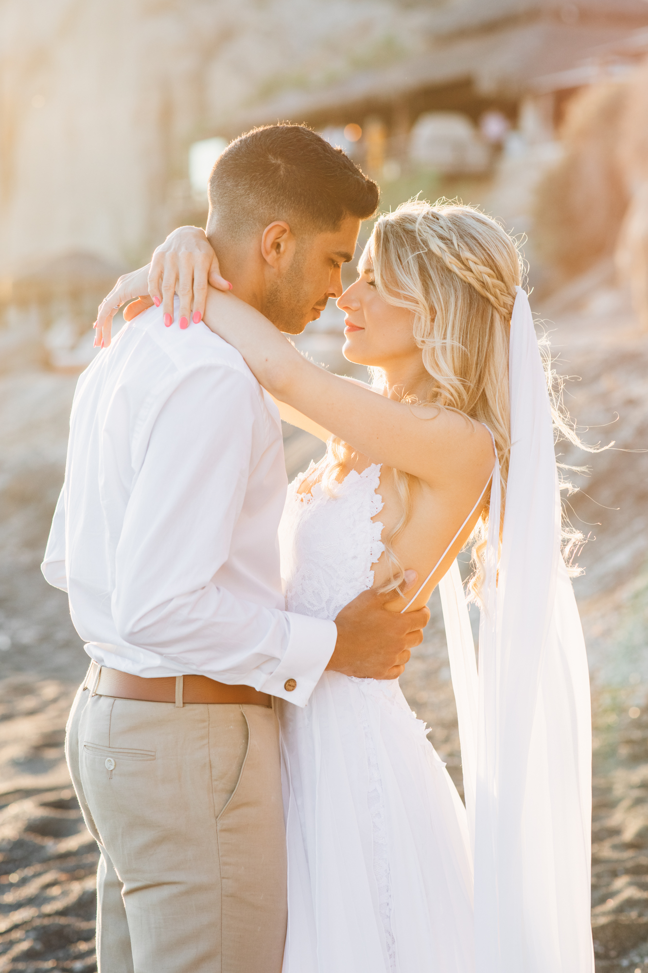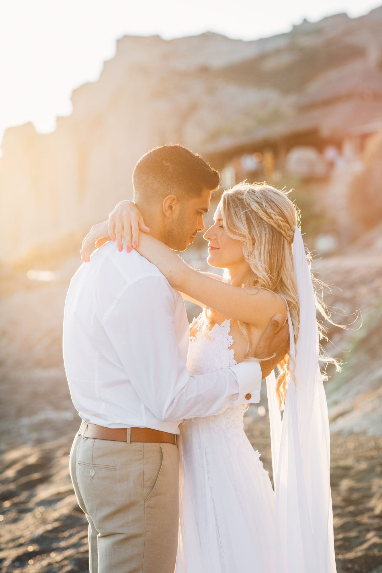 Following the ceremony, guests enjoyed a cocktail hour on the terrace of Venetsanos Winery. They savored local wines while soaking in the island’s breathtaking vistas. Meanwhile, we seized the opportunity to capture more photos with the newlyweds. Our photo session unfolded against the backdrop of Santorini’s enchanting coastline, bathed in the warm hues of the setting sun. Each snapshot captured their deep love for each other, beautifully framed by the captivating beauty of the island’s charm.